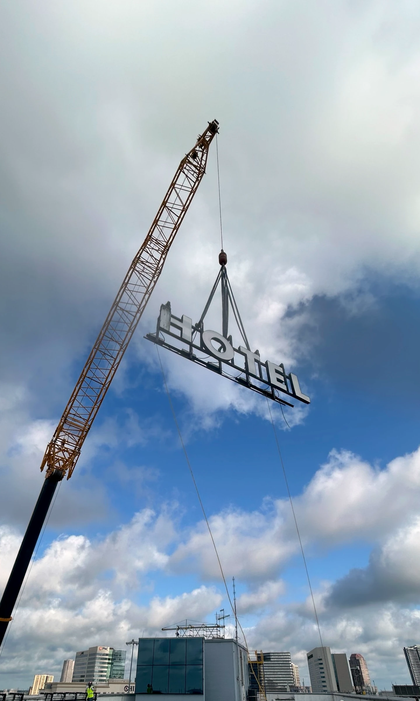 The removal of the hotel sign required careful planning and the use of heavy machinery, and Consolidated Crane & Rigging delivered with precision. When ready, the team brought out the big gun… the Liebherr LTM 1230 Crane with its 230-ton load capacity. It was the perfect tool for the job to reach the sign that was 200 feet up the building facade. The crane’s telescopic boom stretches 250 feet to ensure every aspect of the sign’s removal was handled safely, even with the complexities of working in a busy commercial district like Houston’s Galleria.
