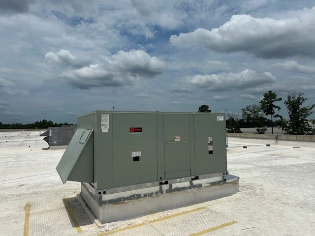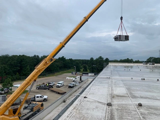In dynamic weather, our crew did an outstanding job rigging, lifting, and removing old commercial air conditioning units, and then installing brand new 20-ton Industrial Trane Rooftop AC units north of Conroe, TX.